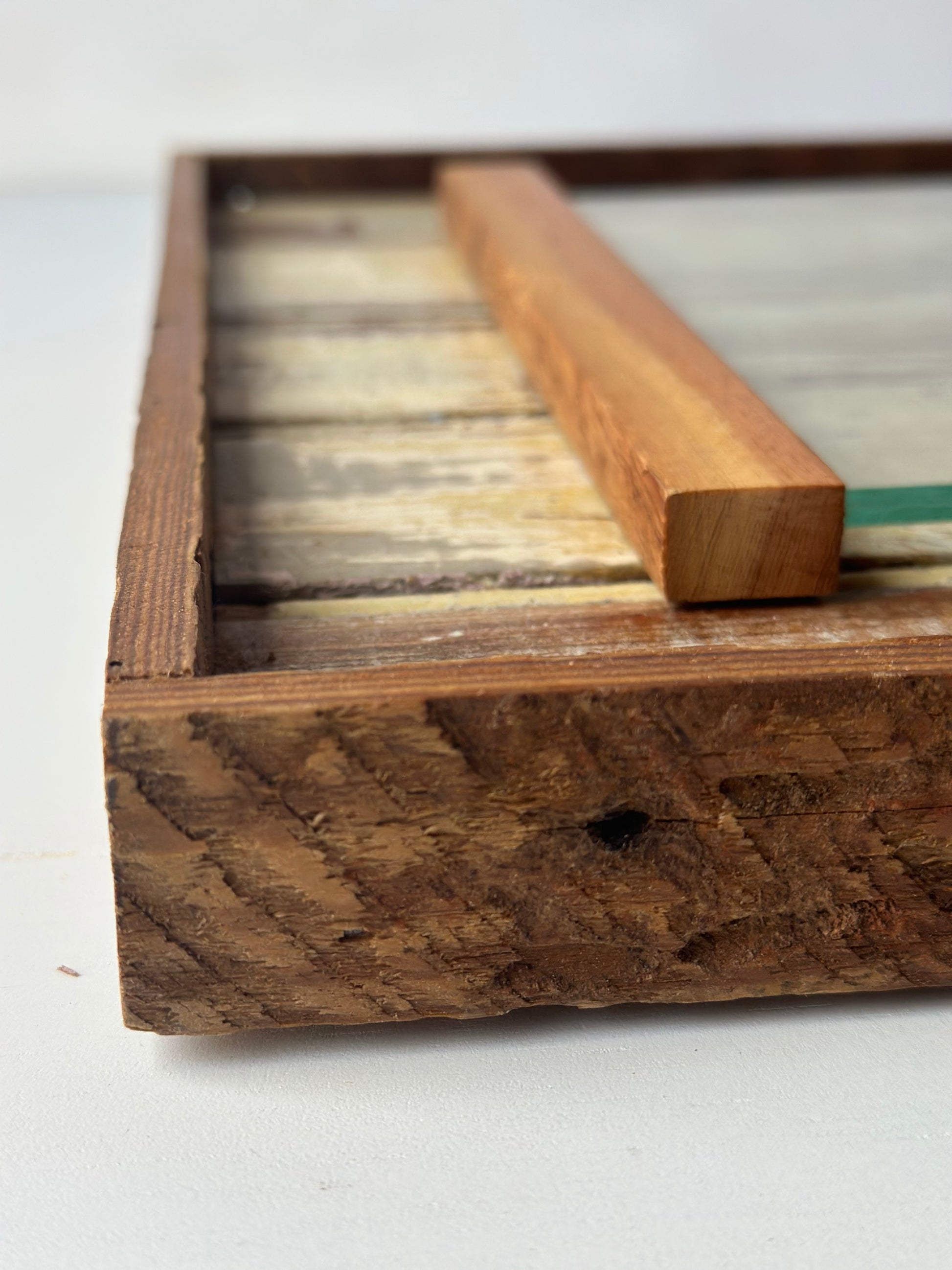 RECLAIMED BEAD BOARD SCRAPED, JOINED AND WRAPPED WITH LATH; TWO MOUNTING BLOCKS FASHIONED FROM FLOORING SUPPORT THE SUSPENDED GLASS PICTURE AREA CREATING A UNIQUE SCULPTURAL ELEMENT.