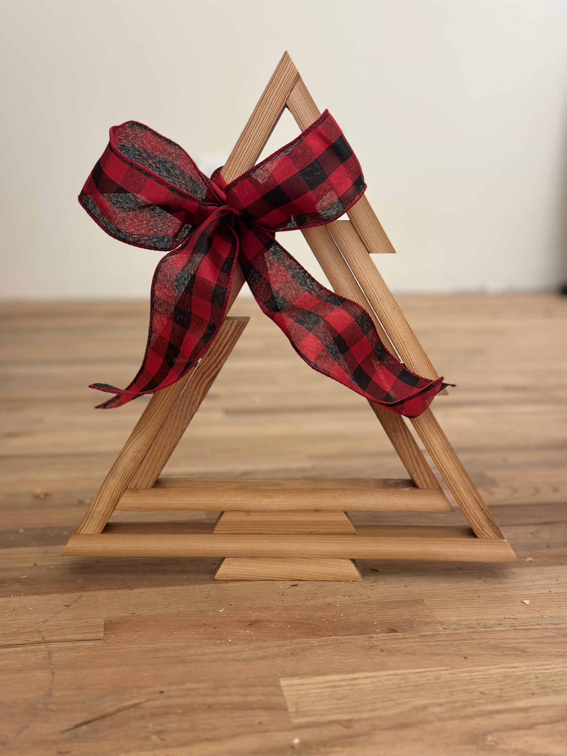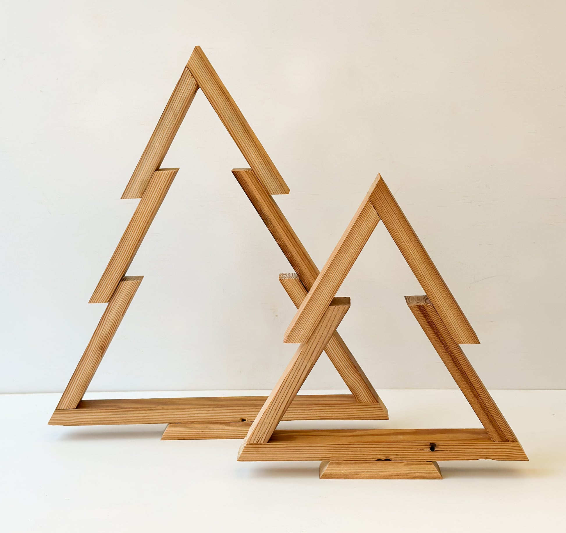 THESE DARLING TREE SETS HAVE BEEN HANDCRAFTED FROM LUMBER OF A HOME BUILT IN 1936. DISPLAY YOUR SET ON THE MANTEL OR BUFFET AND WARM YOUR HOLIDAY HOME WITH A BIT OF HISTORY.