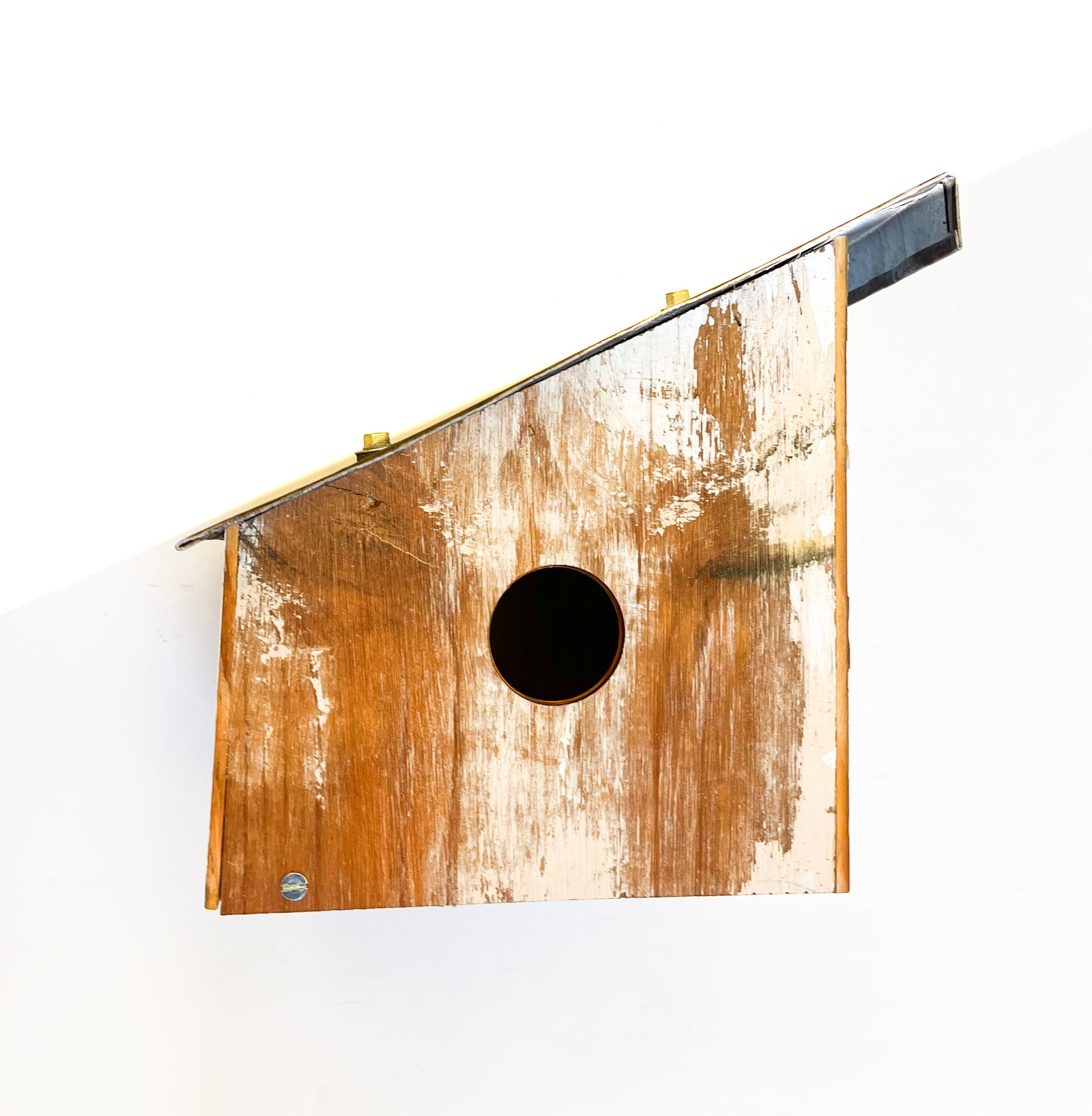 THIS FUN MODERN DESIGN BIRD HOME CLAD IN RECLAIMED WHITE WALL BOARD WITH SALVAGED A TIN ROOF.
